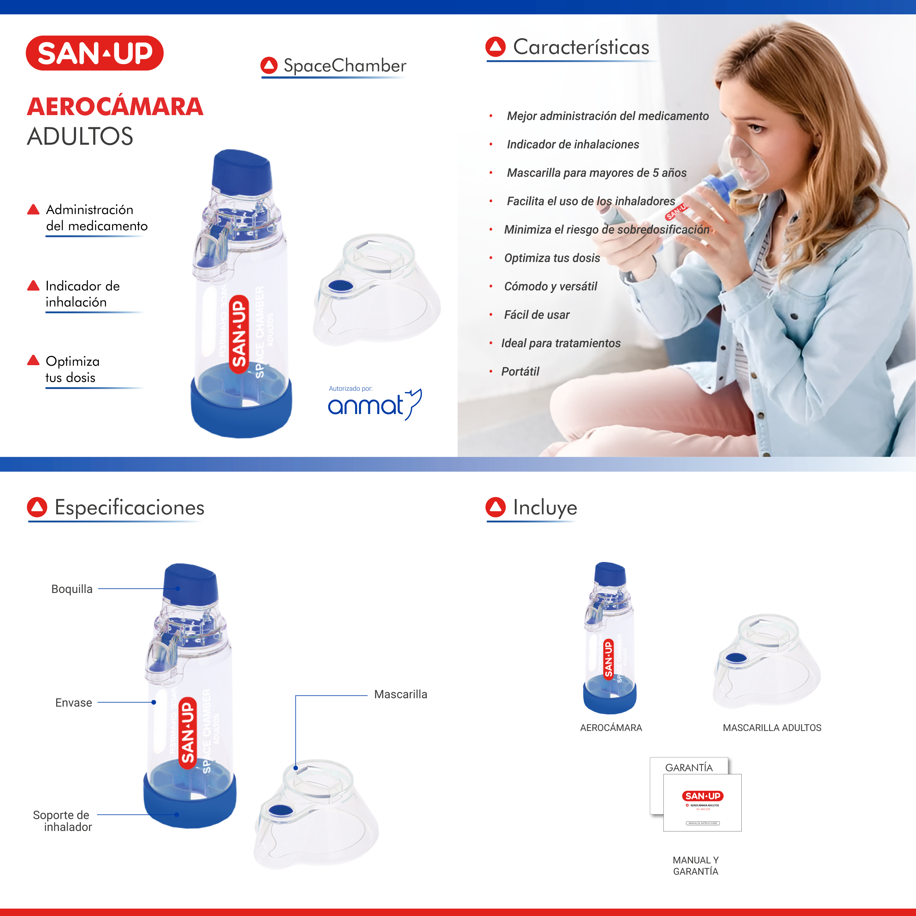 Su máscara anatómica de silicona se ajusta perfectamente al rostro, garantizando un sellado hermético que maximiza la absorción del medicamento. Uno de sus principales beneficios es el indicador de inhalación integrado, que ayuda a confirmar el uso correcto del inhalador asegurando una terapia más segura y efectiva.